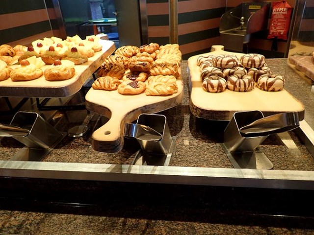The buffet didn’t have a gluten free section, but the pizza station had gluten free items for the asking. In the morning it’s the waffle and crepe station and they could make gluten free crepes or toast and had gluten free muffins available as well. Later they could make gluten free pizza and had some sort of gluten free dessert out where people could take it. Usually just jello or a flan thing or sometimes the same flourless chocolate cake the dining room served. You could ask for gluten free cookies. They had some really good chocolate chip ones that were also dairy free, but quickly ran out and then they just had butter cookies.