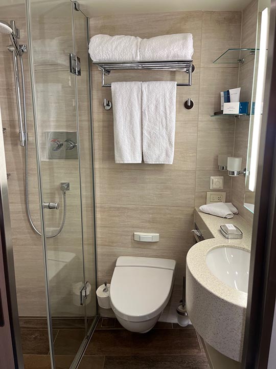 Racks above the toilet held two each of bath and hand towels. Other than when we first boarded and they were at the opposite end of the counter the steward always put the washcloths right next to the sink. That area tended to get a bit wet so we moved them to the towel rack. Towels left hanging were not replaced when the room was cleaned, but those left on the floor were. The bathroom had a small clothesline that could be pulled across the top of the shower, and an additional shelf under the sink.