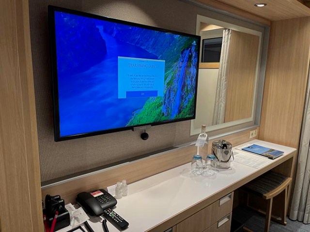 It looked like there were 6 drawers under the desk, but there was actually just one set of 3 and what looked like the other 3 drawers had a refrigerator hiding behind it. There was a skinny little ledge above the desk useful for holding small things. One end of the desk was open underneath with space for a stool and a garbage can. The stool was the only furniture in the room besides the bed. There was a big screen TV above about half of the desk and a mirror over the rest. There were also mirrors on the back of the cabin door and in the bathroom.