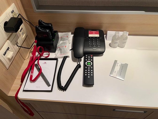 The room had 4 each of American and European outlets, though one of the European ones was taken by the charger for the Quietvox audio boxes used for the daily tours included with the cruise at each port. There was one of each outlet above the nightstands and one on either end of the long narrow desk that ran from where the closet ended to the outer wall. We found a hair dryer hidden in the closet.
