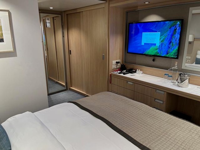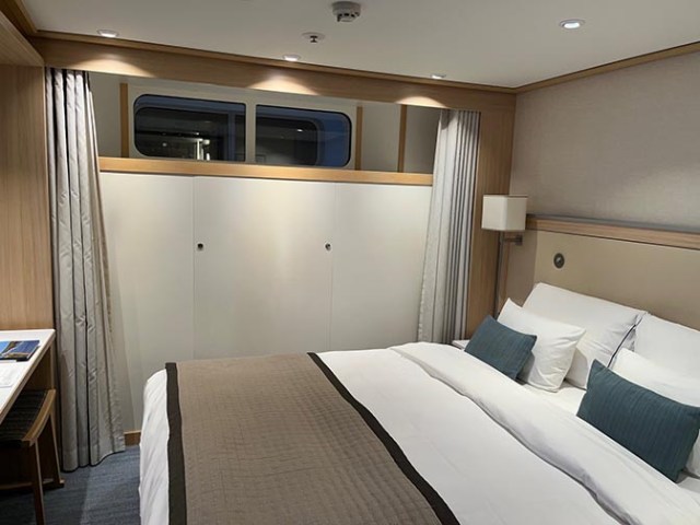 The room had a comfortable bed with two pillows provided for each side. Like ocean cruise ships, the bed can be spread apart into two separate beds if needed. Upstairs in the lounge people could get a small blanket, which besides using up there when chilly, if you brought it to the room it stayed there even if left out when the steward cleaned. Quite useful in a cold room. There was a small nightstand on each side of the bed. No drawers, but it did have a cubby for a bit of extra storage and enough surface space for small things like a phone to sit at night. It also had a pull-out shelf if someone needed more surface area for something.