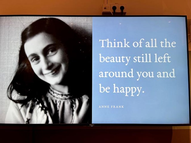 There were 2 lines to get in. One for people going straight to the museum and the other for people who had tickets for the introductory program, which ours included. For that program you have a specific entry time and can’t come earlier because you would miss the introductory part. If you come late you can still go into the museum, but will not get to see the introduction, which was in a sort of classroom that had some photographs and a few artifacts from Anne’s life. There was also a timeline with dates and photos from her birth to her death.