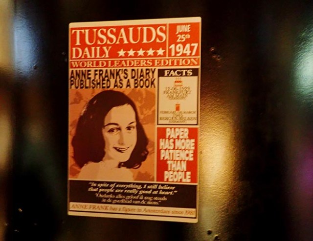 Although pictures were not allowed at the Anne Frank Museum, Madam Tussaud’s Wax Museum in Amsterdam has a figure of Anne, in a room that contains a few furnishings that may be similar to what were in the house. Since the Nazis took everything the replicas are probably not exact. There’s also a wax replica of the bookcase used to hide the entry to the annex and pictures are allowed in the wax museum.
