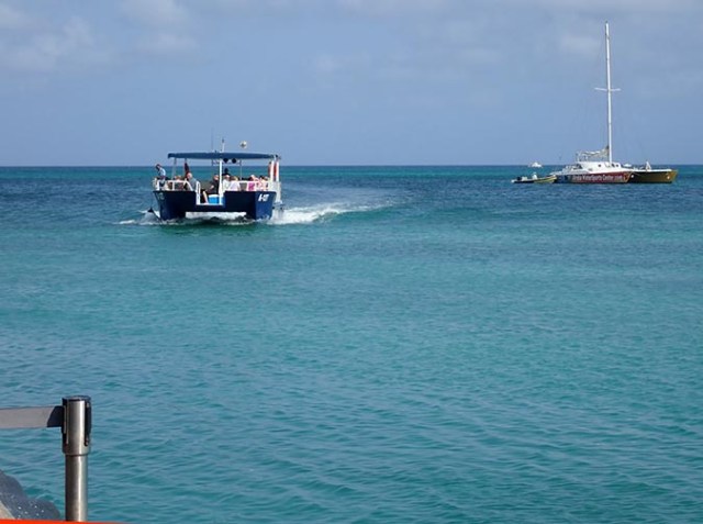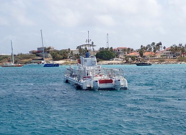 After the first two land stops the bus brought us to a pier where a boat picked us up to take us out to the semi-sub. This one was run by Atlantis, the same company who has the Atlantis subs, which are actual submarines that dive down deep into the water. Semi-subs have a top portion that stays above the water and a below-water-level window-lined chamber passengers descend into to view fish and whatever else is under the water through the windows. The submarine tour in Aruba cost a lot more than the one we took on the semi-sub.