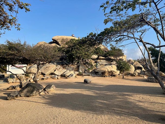 The Aruba by Land and Sea tour started out meeting in front of the port building shortly after the ship docked. It was early in the morning so there weren’t any lines to get off the ship. Nothing was open yet so the only people who had any reason to leave were those with early tours. After checking everyone in and getting on the bus we headed to our first destination at the Casibari Rock Formation. This little rock mountain and surrounding rock garden reminded me of the Baths at Virgin Gorda, but without the pools. It looked a lot like batholiths, but actually consisted of tonalite boulders. Tonalite is an intrusive igneous rock, meaning it forms from magma that cools slowly beneath the Earth’s surface. These are often a component of batholiths, but batholiths which are also formed from slowly cooled magma form deeper in the earth and contain other types of rock. Tonalite forms from one magma intrusion whereas batholiths form slowly over millions of years and combine multiple intrusions. Both surface through tectonic uplift and erosion. Batholiths cover a larger area above and below the surface.