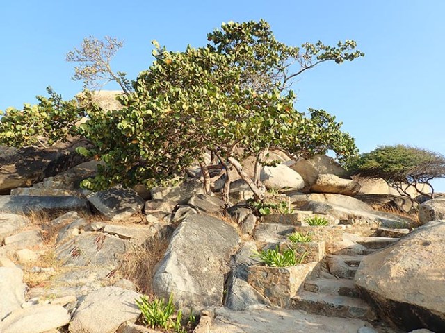 There is a stairway up to the top of the Casibari Rock Formation. At one point people have to duck down and go through a hole in the rocks. The guide warned us to keep our heads down, but the rock got some people anyway because as you approach the end of the tunnel the overhanging rock is just a bit lower than what you are already ducking for, right about the spot where you think you’re just about out and people are more likely to start lifting their heads up rather than ducking down farther. Plus if you are already ducking down you’re more likely looking down than up and may not see that lower hanging bit of rock.