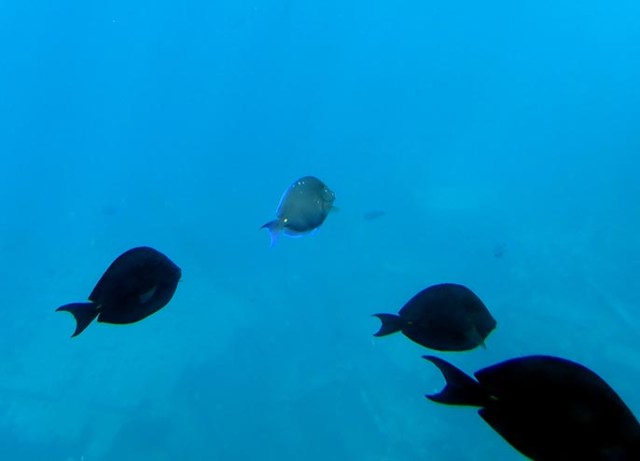 One snorkeler did come close, but he was from the semi-sub crew, giving people something to see with his antics and feeding the fish so a bunch would come close to our windows. Some blue tangs had already come up to the window, but he brought in schools of snappers and sergeant majors as well as some other fish. He was able to free-dive all the way to the bottom with just a snorkel where you can only get air at the surface. Apparently he could hold his breath for a long time since he stayed down there quite awhile.
