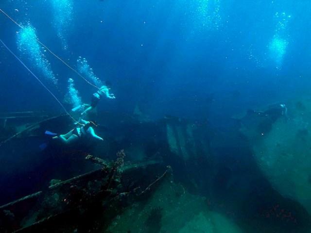 The wreck is 80 feet long and in pieces so you can never see all of it at once. The people getting the best view were the scuba divers and also some people doing snuba, which is sort of a combination of scuba and snorkeling. They have a hose going to a surface air supply rather than carrying a tank on their back like scuba divers or getting air from just above the water’s surface through a tube like snorkelers. Our ship did not offer snuba, but they likely came from one of the many hotels near the dock where we boarded the boat that took us out to the semi-sub.
