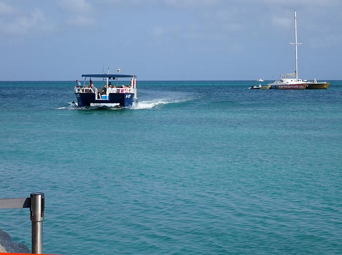 transport boat coming into the dock to take people out to a semi-sub in Aruba