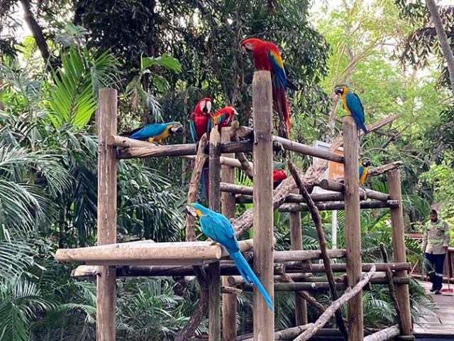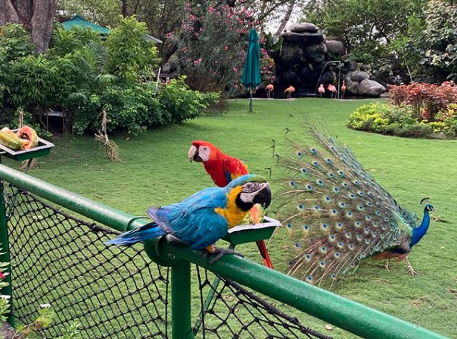 The second most noticeable birds in the zoo are macaws, which are all around the park in abundant numbers and various colors. These are also free-range, flying wherever they please. All of these birds probably stay there voluntarily due to the food they are given daily. Why work hard for it when somebody offers it up for free.