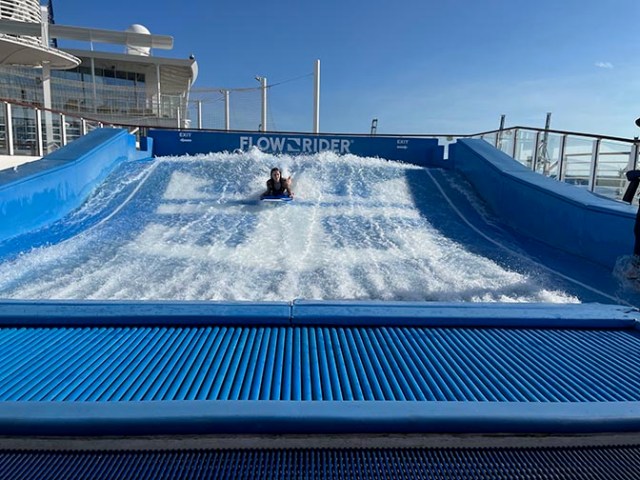 There is also an open area starting from deck 6 at the back of the ship called the Boardwalk. It has shops, eateries, an arcade, and a pub and sports bar on the outer edges. There are rooms with balconies overlooking this area as well. In the center there’s the carousel, the landing for the dry slides, and at the back the aquatheater. The aquatheater is the home for Hiro, a quite impressive water-based show that includes divers, dancers, an aerialist, high wire, and more. The ship also has a regular theater for production shows, but that’s not all.