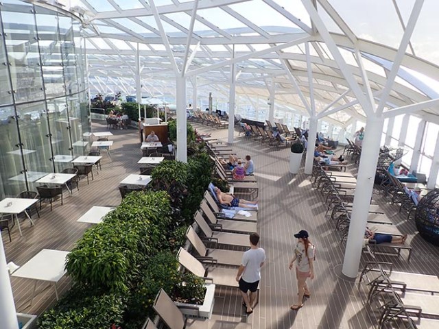 There’s an adults only solarium at the front of the ship with a bar, hot tubs, and lots of deck chairs to relax in. The glass panels don’t fully enclose it though. They run in strips with open areas in between. It’s fine on hot days, but not so much when the weather is cold or rainy as it was for much of this trip.