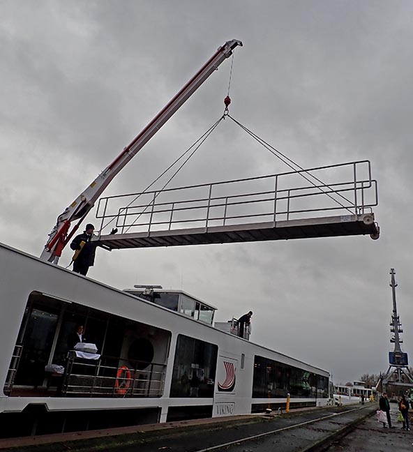 lowering the gangway from the top deck of Viking Skirner down to the dock