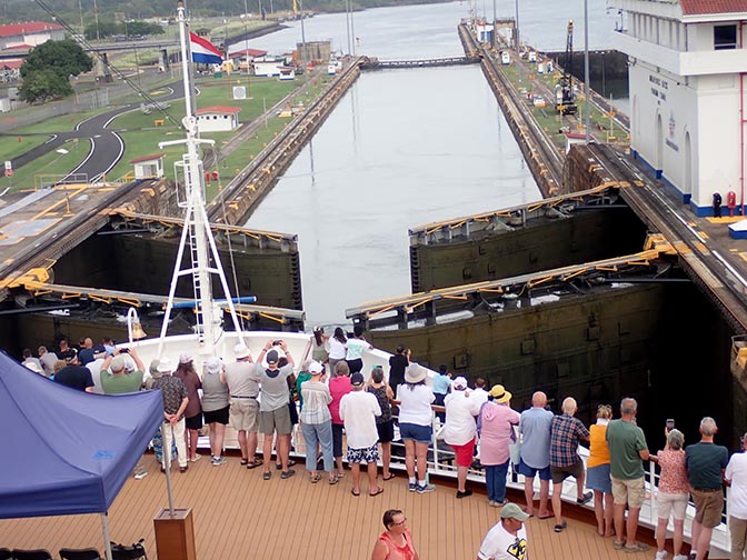 people on the deck 5 bow and a few crew on the deck 4 bow watching the gates open in Miraflores Locks