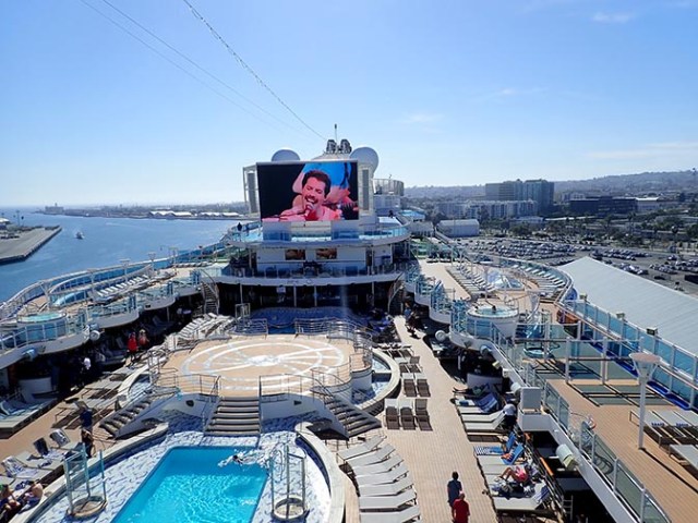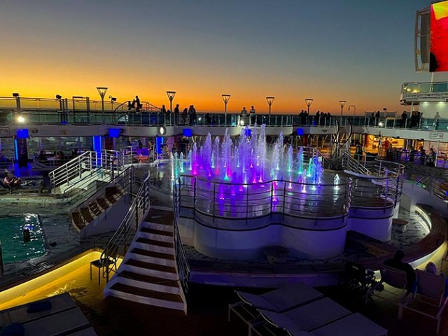 Besides the public spaces on decks 5, 6, and 7, there are more public areas on the upper decks. The centerpiece of the Lido deck pool area on deck 16 is a fountain pool that has fountain shows in the evenings with lights and music to go along with the fountains. There’s also quite an extensive buffet on that deck.