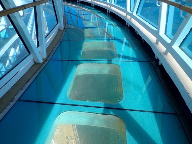 A standout feature of this ship class is the seawalk, which is a little walkway on either side of the Lido deck pool area that curves out from the side of the ship and has glass panels in the floor so people can look down and see the lifeboats and the sea as they walk through it. If the ship is at a dock you can look down at the port through the floor on whichever side is by the dock.