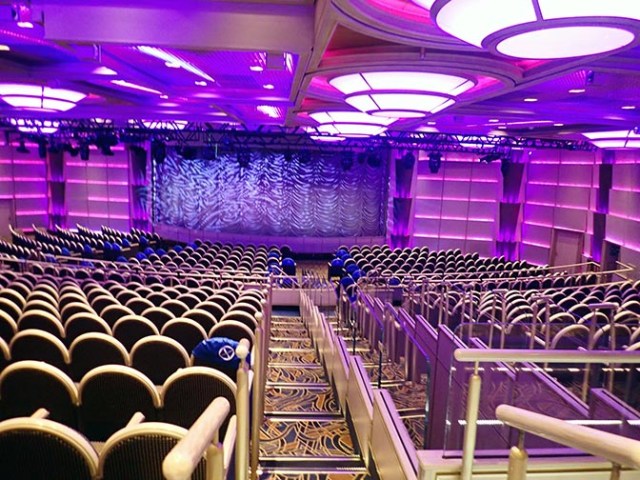 The main theater is at the front of decks 6 and 7. It does not have balcony seating like a lot of cruise ship theaters do. Also no poles to blocking the view of some seats so most have a pretty good view of the stage.