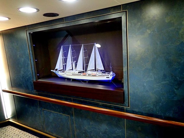 The middle stairway had encased ship models of old sailing vessels on most decks. Each one looked different in size and style. There were other models of old vessels in other areas of the ship as well. Old ships also appeared in some of the ship’s other artwork.