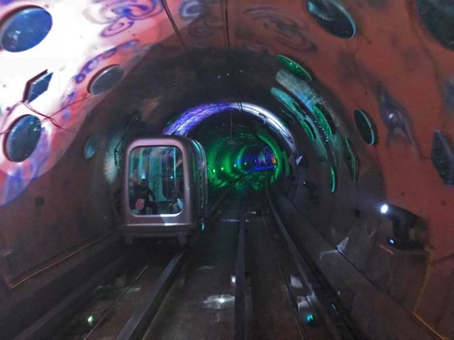 In between the boardwalk has some open space in the middle, with shops and eateries around the edges. Rising up above on both sides you see the balconies of what would otherwise be interior rooms reaching up to deck 14. Near the back, just in front of the AquaTheater sits the exit to the 10-deck Ultimate Abyss slides. These are not waterslides. You slide down them on a mat which you get at the top and leave at the bottom. Eateries on the boardwalk include a hot dog stand and a burger joint. The Dog House is free, but there is a cover charge at Johnny Rockets, except at breakfast.