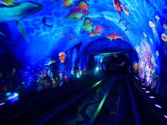 Enter the Boardwalk to a real working carousel, available for rides at no extra cost during the hours it is open. The boardwalk area is open to the sky with balcony staterooms rising many decks above. The water show theater sits at the back, which also has movie screens. Rock climbing walls are located on either side rising up the walls just forward of the aqua theater. Bars, eateries, shops, and an arcade sit along either side. The ultimate abyss slide exits near the aqua theater, the entrance is 10 decks up.