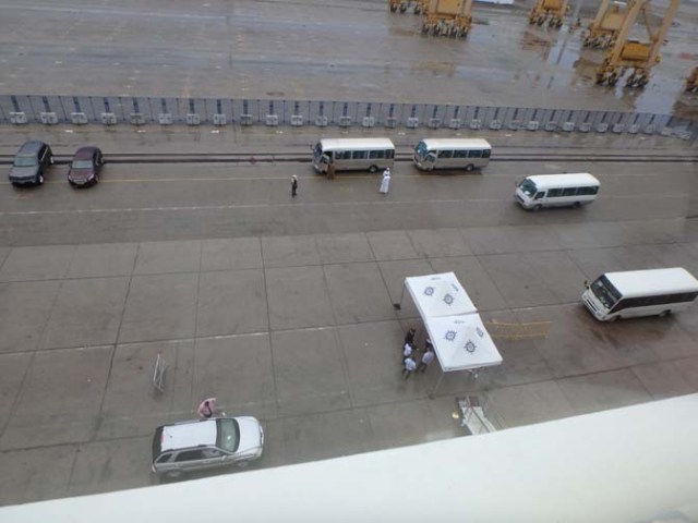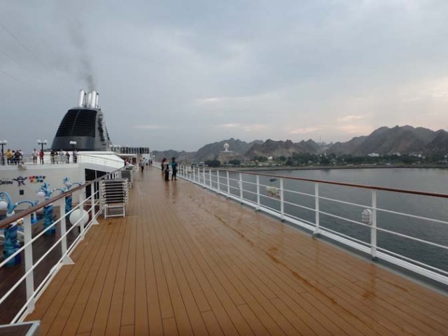 It also has the best outside promenade deck ever. Not only does it go all the way around the ship, but it is actually set up to be a walking and running track. There’s some deck chairs at the back where people can sit and watch the wake go by, and a couple duck-outs with games. One had shuffleboard and cornhole, the other a ping-pong table. The surface of the promenade deck has two lanes like a track, one for walkers and the other for runners. If you start at the marked starting line it has markings along the way that tell you how far you’ve gone, and signs that give distances for amounts of laps. There are also encouraging signs hanging above and some other signs along the way, some for information and others for entertainment.
