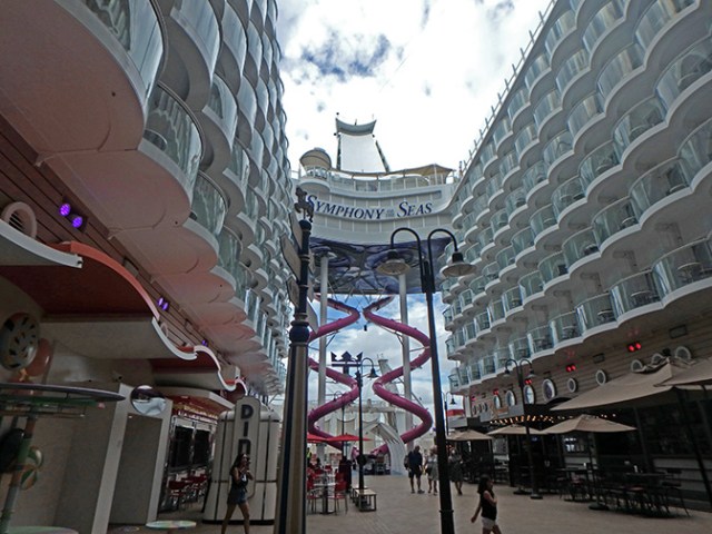 Currently the largest cruise ship in the world, Symphony of the Seas is 1188 feet long and 255.5 feet wide with a passenger capacity of 6680 guests in 2759 staterooms, and 2200 crew. It has 18 decks, 16 of which are open to passengers. This ship is so large the cruise line has the public areas divided up into 7 neighborhoods – Central Park, Boardwalk, Royal Promenade, Pool and Sports Zone, Vitality Spa and Fitness Center, Entertainment Place, and Youth Zone. It has 9 complimentary eateries and 10 premium restaurants or food shops that have an extra cost.