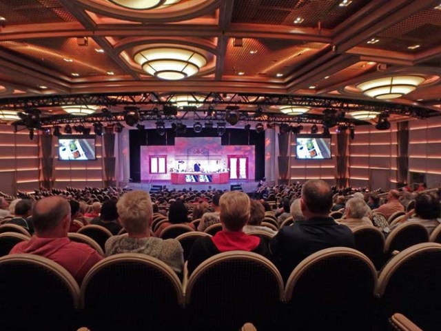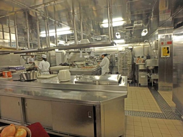 We had a nice sea day on the way up the coast. Linda and I went to a cooking demonstration followed by a galley tour. The cooking demonstration was done half serious, half comedy and was pretty entertaining. The galley tour was short, but free so we can’t complain. Reminiscent of any theme park ride or major tourist attraction, it exited through the gift shop. Which was actually the dining room with a bunch of sale merchandise set up on tables.
