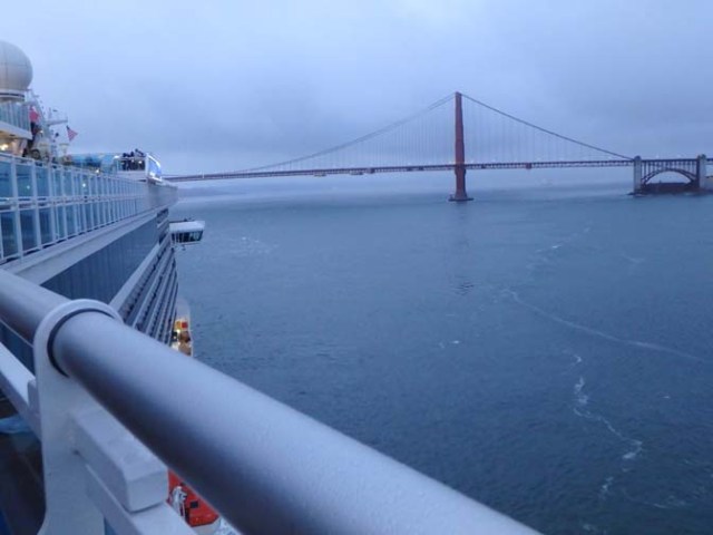 With one-week cruises it always seems like they are trying to boot you off the ship when you barely got on when you see the disembarkation papers in the cabin a few days after boarding. Of course they really just want to get everything organized, but that’s still how it feels. Royal Princess sailed into San Francisco in the early morning mist, but quite a few people were up on deck at 6am to watch it sail under the bridge. It totally looks like the ship is going to hit the bridge until it actually passes under it, then once through it doesn’t look like it ever could have made it, but it really clears by about 10 meters.
