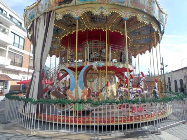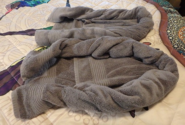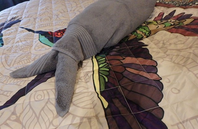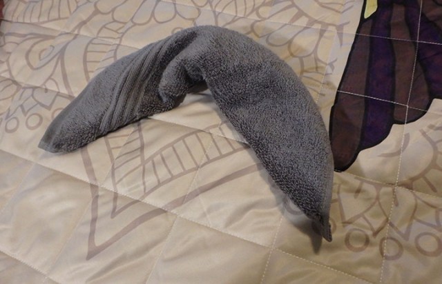 Later we went to a paper airplane contest. Usually it’s just whoever throws it the farthest, but Royal Princess had little runway lights set up in the Piazza, a crew member dressed up like an airplane marshal with little paddles, and a giant hoop. People made their paper airplanes with paper provided there, then one by one tried to throw it through the hoop from the balcony above. Most of them fell short of the hoop. Finally one guy got his through and they gave him a medal. As each person approached for their turn they asked your name and your airplane’s name. I just said ever-hopeful for my airplane name for hoping it actually goes through the hoop. Which it did not. It sailed right over the hoop and landed in the middle of the little runway they’d made out of lights. None of the other planes had landed in the runway so far so they gave me a medal for a perfect landing. More people went, again mostly falling short of the hoop. One kid’s plane went so far it bypassed the runway altogether and would have kept going a bit more if it hadn’t crashed into a barrier at the end of the open space in the middle of the piazza so he got a medal for going the distance. Linda’s airplane flew beyond the hoop, but veered off to the side and didn’t land on the runway so she didn’t get a medal. I only saw just the 3 medals handed out, but we didn’t stay long enough to watch everyone throw so there could have been more later.