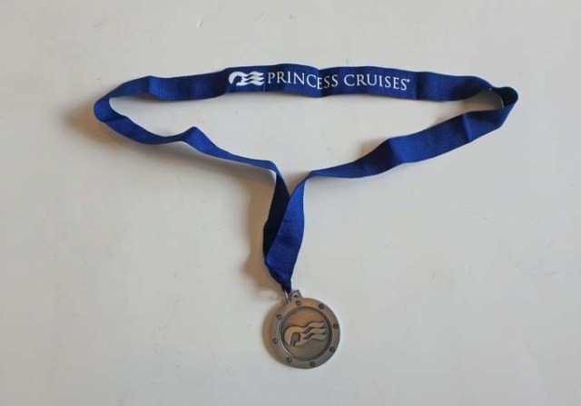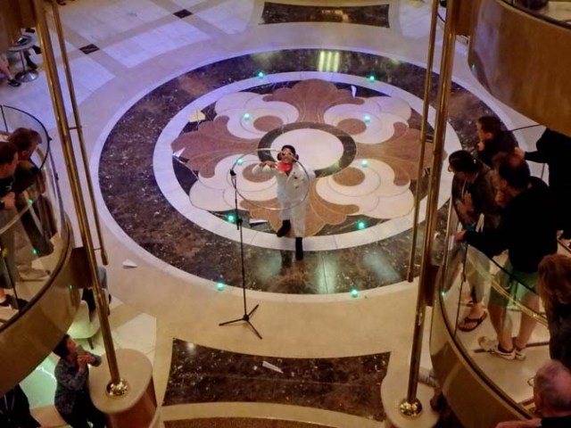 Other events we attended included a paper airplane contest and a champagne fountain. The paper airplane contest was quite different from those I’ve done on other cruise ships where you just try to throw it farther than anyone else. Royal Princess actually had a little runway set up, with a crew member dressed as the aircraft marshaller who waves little lights around and directs the airplane where to go. There was also a hoop. The objective was to throw the airplane down from a balcony where it was intended to pass through the hoop and land on the runway. The hoop was pretty close to the balcony so the plane would have to drop down quite a lot and then go forward to get through. Only a couple people made it.