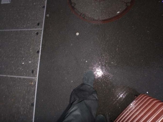 walking to the train station in the rain in Lucerne with iFly luggage and Skechers boots